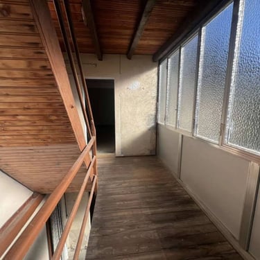 . Os andares superiores são acessados por uma escada interna de tijolos. O primeiro andar compreende uma sala de estar com cozinha americana, sala de estar, banheiro com chuveiro e um quarto de casal.
