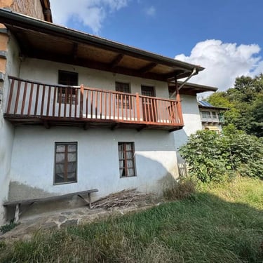 A casa possui chaminés para aquecimento a lenha, um medidor de energia elétrica e um telhado bem conservado.