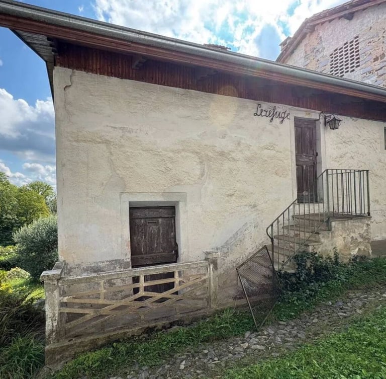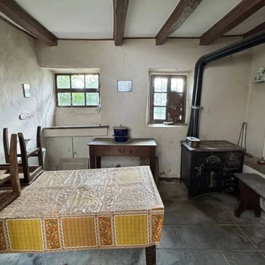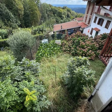 O térreo compreende uma cozinha com uma grande lareira a lenha e outra sala espaçosa com piso de madeira antigo e acesso ao jardim frontal plano e cercado, perfeito para refeições ao ar livre em climas quentes.